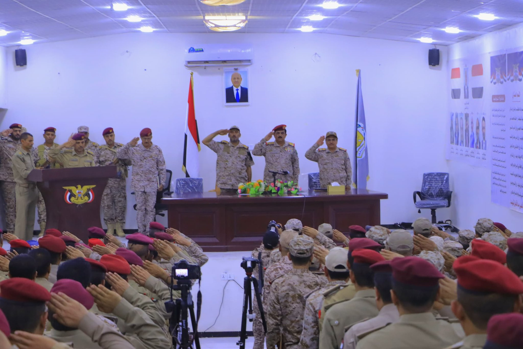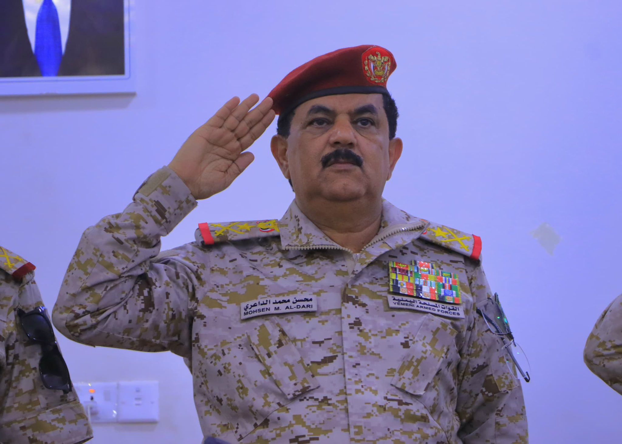 وبحضور رئيس هيئة الأركان العامة قائد العمليات المشتركة الفريق ركن صغير بن عزيز والمفتش العام للقوات المسلحة اللواء الركن عادل القميري نقل الفريق الداعري تحيات القيادة السياسية والعسكرية العليا.
