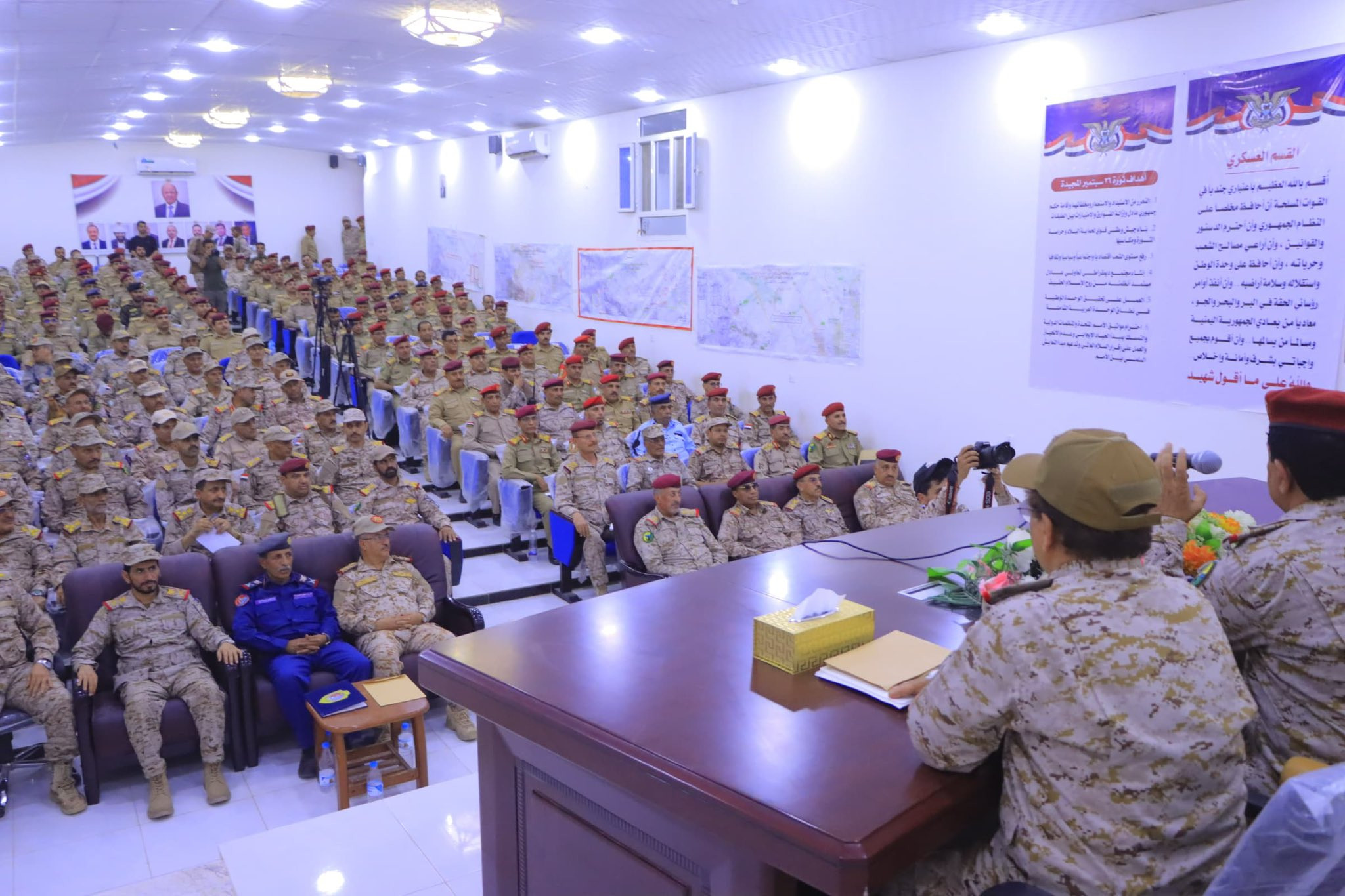 عقد وزير الدفاع الفريق الركن محسن محمد الداعري اليوم اجتماعا موسعا برئاسة هيئة الأركان العامة والهيئات والدوائر ومنتسبي الدفعة 17 قيادة وأركان القاعة الثانية في محافظة مارب.