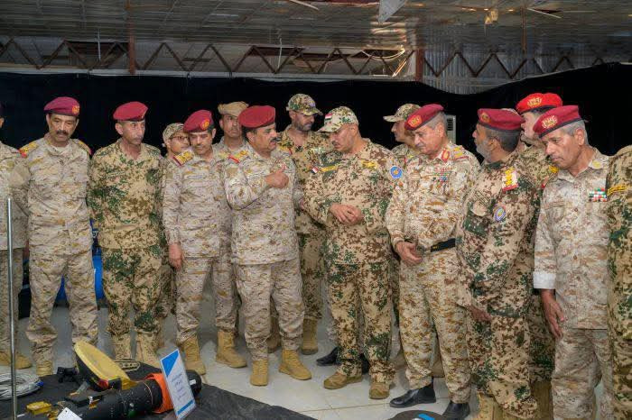 عضو مجلس القيادة طارق صالح يستعرض مع وزير الدفاع نماذج من ترسانة الأسلحة الإيرانية التي ضبطتها المقاومة الوطنية